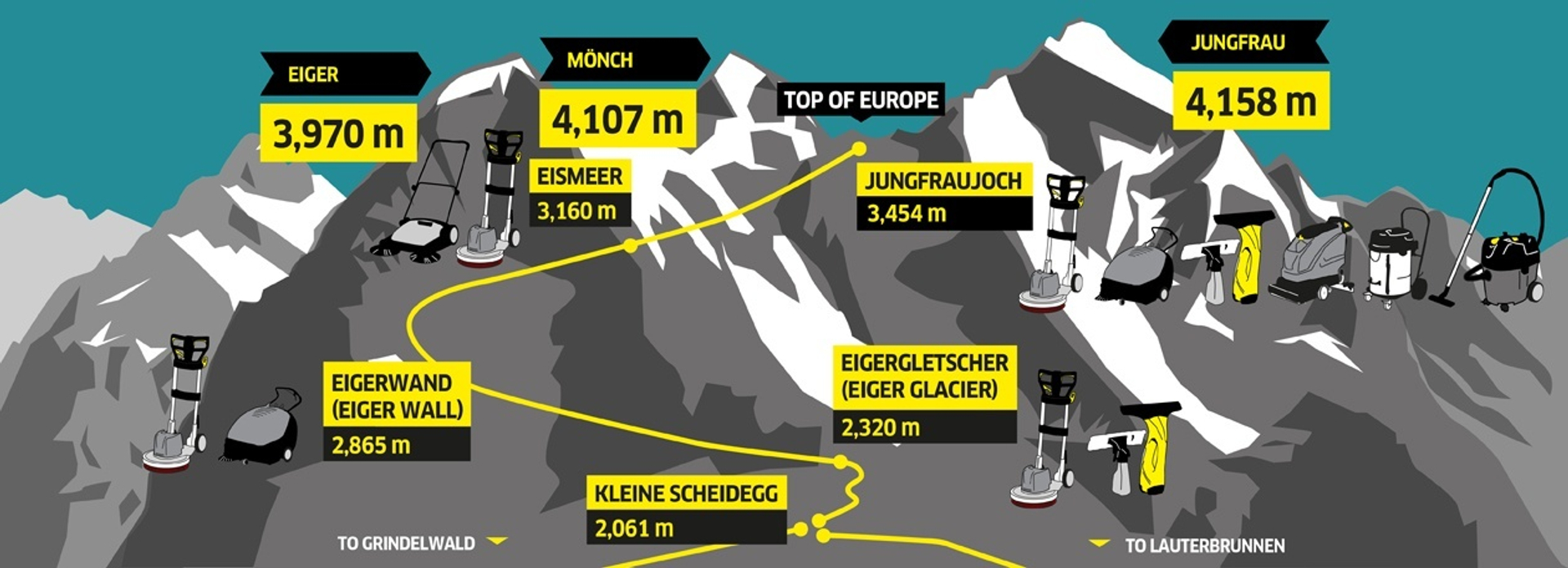 Абсолютно необходимо увидеть Юнгфрауйох в Бернском высокогорье, которое находится на высоте 3454 м. Постоять один разок на «Вершине Европы», самой высокой железнодорожной станции Европы, и полюбоваться уникальной панорамой ледника Алеч и окружающих ледовых гигантов - ежедневно сюда приезжает до 5000 туристов, но они также оставляют много грязи. Работники железной дороги Юнгфраубах используют чистящее оборудование "Kärcher" для ежедневной уборки поездов и зданий для своих гостей.