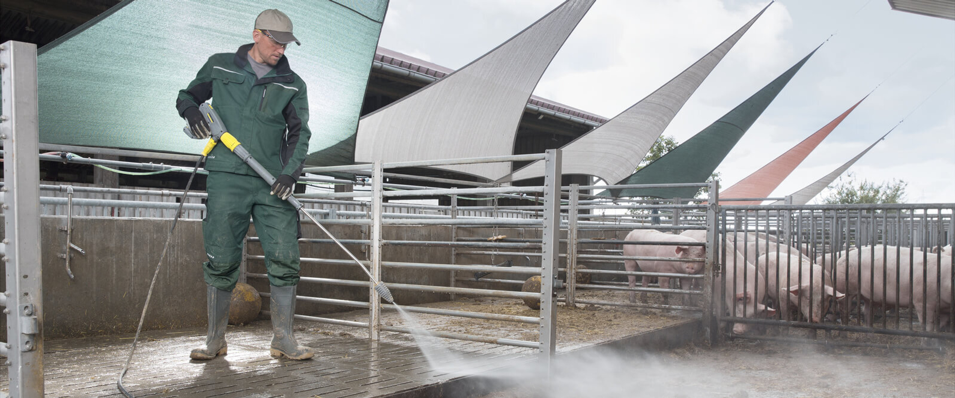 Главным условием эффективной уборки в свинарниках является высокая производительность смывания грязи. Это значит, что от аппарата высокого давления требуется большой расход воды при относительно невысоком давлении. В таком случае загрязнения смываются с поверхностей без разлета брызг грязной воды во всех направлениях.