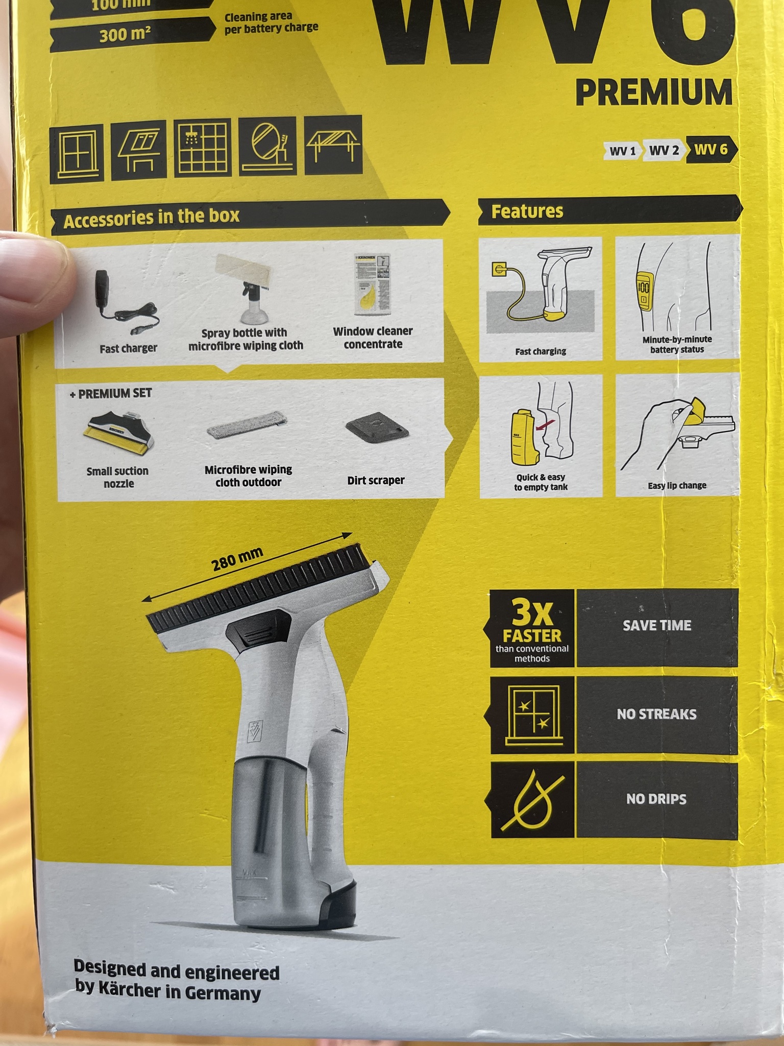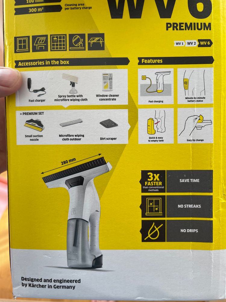 Инновационная система Window Vac от Kärcher долгое время без усилий очищала ваши окна от грязи и оставляла поверхность без разводов, а инновационная технология всасывающего сопла делает ее еще более легкой. Более длинная конструкция всасывающего сопла WV 6 Premium позволяет использовать его от верхнего края очищаемой поверхности до нижнего угла, всего за один раз. Теперь вы можете быстро и легко удалять излишки жидкости с поверхностей, близких к полу, вплоть до самого края. Увеличенное, до 100 минут,время работы от аккумулятора, а также дисплей, который показывает оставшиеся время работы аппарата, что облегчает планирование вашей уборки. В комплект WV 6 Premium также входят две салфетки для внутренней и наружней чистки, пульверизатор, небольшой скребок для грязи и 20 мл моющего средства. С WV 6 Premium чистка не имеет границ