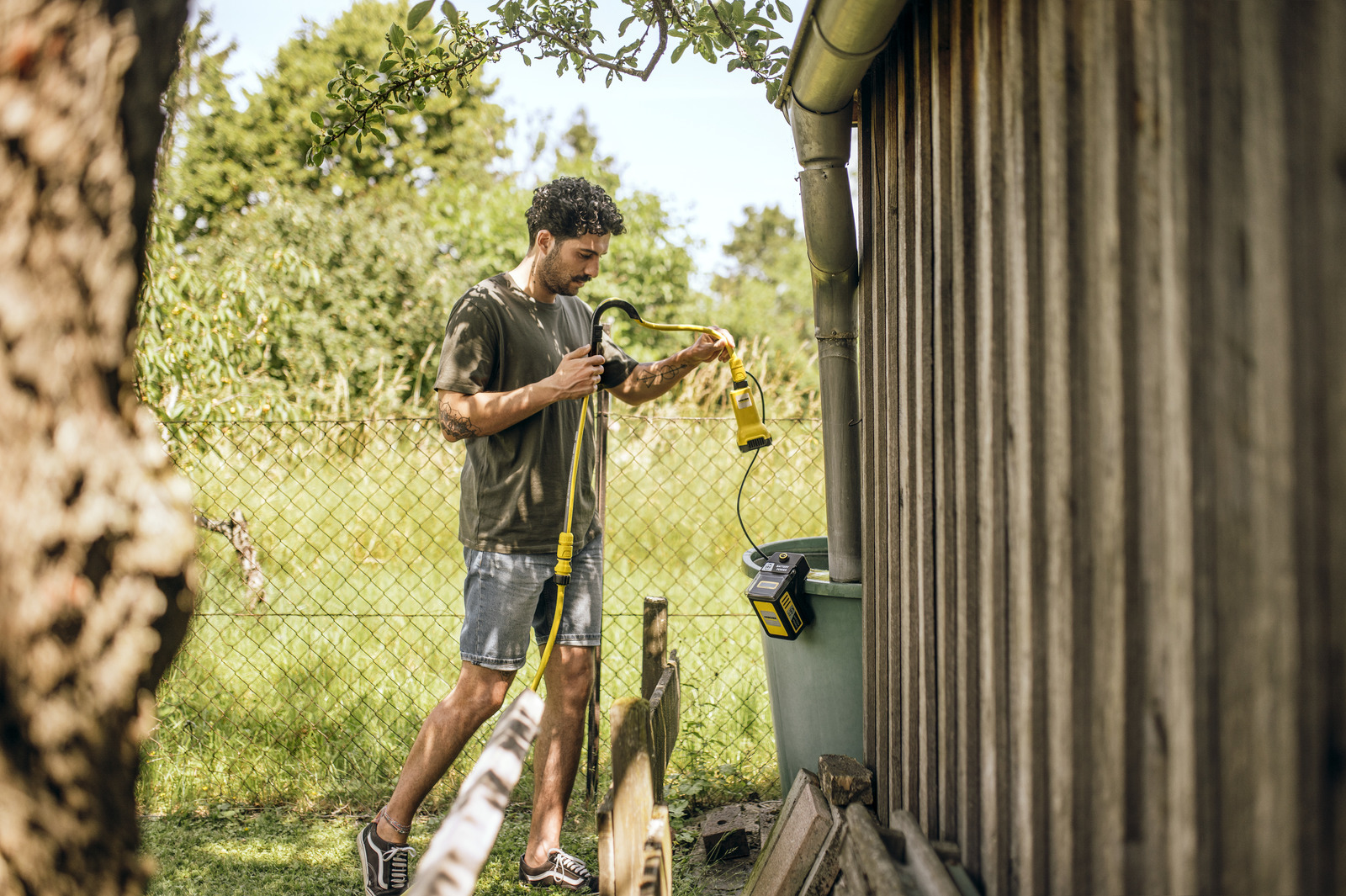 Экологичное и экономичное решение: насос для бочек BP 2.000-18 Barrel – превосходная альтернатива садовой лейке в ситуациях, исключающих возможность подключения к электросети. Его использование для полива растений дождевой водой, богатой питательными веществами, уменьшает расход дорогостоящей водопроводной воды. Насос снабжен кронштейном для надежного крепления на краю бочек разных типов и размеров, который, кроме того, позволяет устанавливать аккумулятор и удобно управлять насосом при помощи встроенного выключателя. При этом прозрачная крышка аккумуляторного отсека гарантирует удобный контроль дисплея аккумулятора, выполненного по технологии Real Time. Во избежание перегиба шланга в процессе полива для него предусмотрена направляющая, обеспечивающая постоянный поток воды. В зависимости от конкретных условий эта направляющая может устанавливаться в трех положениях: присоединяться слева или справа к держателю аккумулятора или свободно закрепляться на краю бочки. Благодаря компактной конструкции легкий насос может также опускаться внутрь емкостей с отверстиями малых размеров, например, в кубические контейнеры. Встроенный входной фильтр защищает его от загрязнения.
